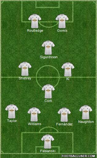 Fabianski · Williams · Fernàndez · Taylor · Naughton · Cork · Shelvey · Sung-Yong Ki · Sigurdsson · Routledge · Gomis