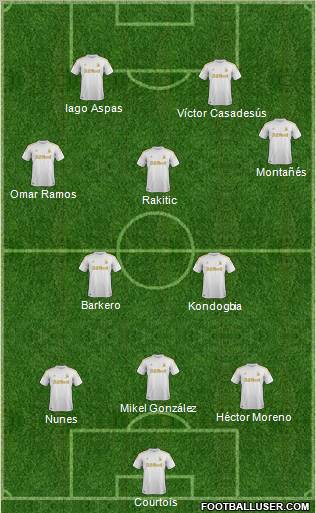 Tremmel · Monk · Bartley · Routledge · Britton · Moore · Proctor · Michu · De Guzmán · Lamah · P. Hernández · Ki · Dyer · A. Williams (c) · Àngel Rangel · Taylor · Chico · Vorm