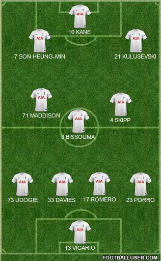 Son 450′ (5G [7S 2G 2A]) · Johnson 351′ (5G [15S 0G 0A]) · Maddison 408′ (5G [9S 1G 2A]) · Kulusevski 348′ (5G [9S 0G 1A]) · Solanke 268′ (3G [9S 1G 0A]) · Bissouma 181′ (3G [1S 1G 0A]) · Porro 448′ (5G [10S 1G 0A]) · Udogie 433′ (5G [1S 0G 0A]) · Vandeven 360′ (4G [1S 0G 1A]) · Romero 450′ (5G [6S 1G 0A]) · Vicario