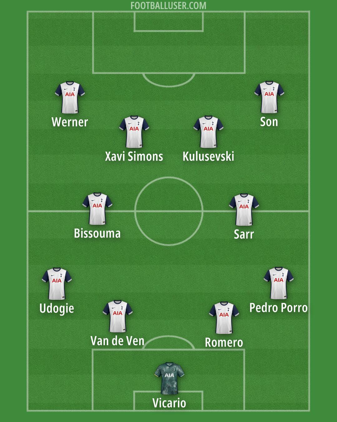Romero · van de Ven · Danso · Udogie · Porro · Sarr · Bentancur · Solanke · Kulusevski · Maddison · Vicario