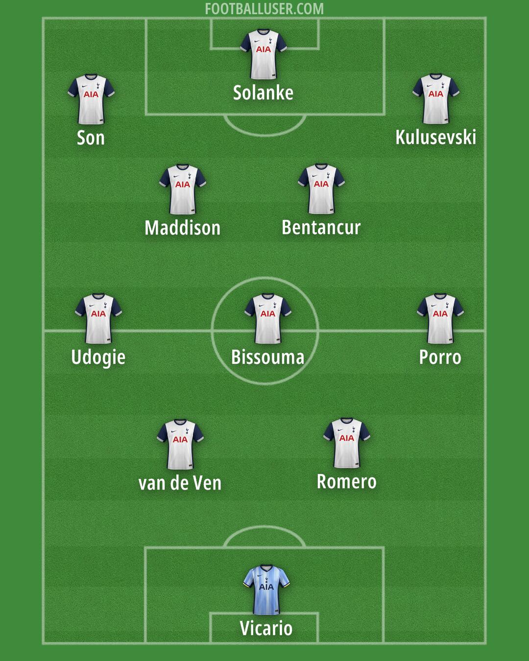 VICARIO (Kinsky) · PORRO (Spence) · ROMERO (Vuskovic) · VAN DEN VEN (Danso) · UDOGIE (B.Davies) · BENTANCUR (Gray/Sarr) · BERGVALL (Kulusevski) · GIBBS-WHITE (Maddison) · KUDUS (Odobert) · B.JOHNSON (Tel) · SOLANKE (Son)