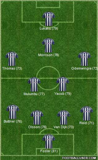 Foster (79) · Dawson (70) · Olsson (76) · Reid (70) · Ridgewell (70) · Mulumbu (76) · Yacob (78) · Allan (68) · Kosecki (71) · Mackay-Steven (75) · Lukaku (78)