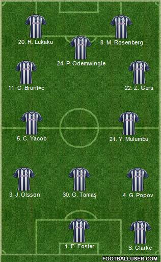 20. R. Lukaku · 8. M. Rosenberg · 24. P. Odemwingie · 11. C. Brunt=c · 22. Z. Gera · 5. C. Yacob · 21. Y. Mulumbu · 3. J. Olsson · 30. G. Tamaș · 4. G. Popov · 1. F. Foster · S. Clarke