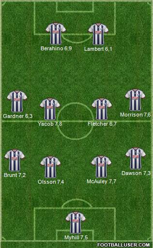 Myhill 7 · 5 · Olsson 7 · 4 · McAuley 7 · 7 · Brunt 7 · 2 · Dawson 7 · 3 · Yacob 7 · 8 · Fletcher 6 · 7 · Gardner 6 · 3 · Morrison 7 · 6 · Lambert 6 · 1 · Berahino 6 · 9