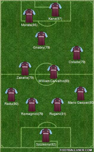 Arnautovic/Antonio · ............/Carroll · Lanzini/............ · ............/Obiang · ............/Noble · ............/Zabaleta · Masuaku/Cresswell · Reid/Kouyate · ......./Rice · Ogbonna/.......... · ........./..........