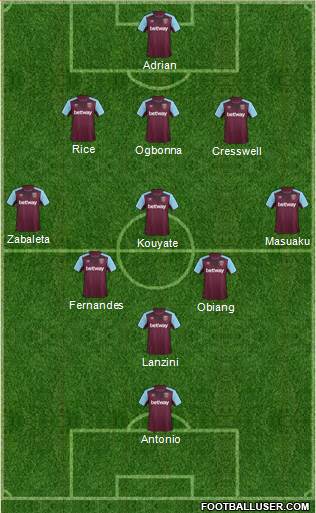 13 Adrian · 27 Evra · 41 Rice · 2 Reid · 3 Creswell · 5 Zabaleta · 10 Lanzini · 8 Kouyate · 16 Noble · 7 Arnautović · 17 Chicharito