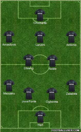 Adrian/Hart · Fonte/Burke · Collins/Ogbonna · Reid/Rice · Zabaleta/Byram · Cresswell/Masuaku · Kouyate/Oxford · Obiang/Cullen · Noble/Lanzini · Arnautovic/Carroll/Sakho · Antonio/Ayew/Hernandez · FERNANDES(LT INJURY)