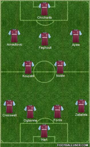 Hart · Ogbonna · Fonte · Cresswell · Zabaleta · Noble · Ayew · Kouyaté · Antonio · Arnautovic · Chicharito