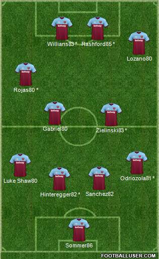 Fabianski · Ogbonna · Diop · Cresswell · Coufal · Rice · Soucek · Benrahma · Antonio · Bowen · Haller