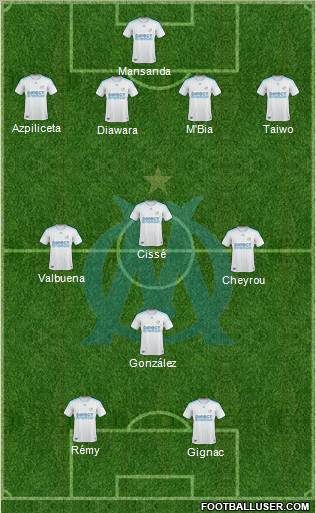 Mandanda 30 · Diawara 21 · Mbia 17 · Bocaly 2 · Taïwo 3 · Kaboré 12 · Valbuena 28 · Cheyrou 7 · Lucho 8 · Rémy 11 · Gamiero 9