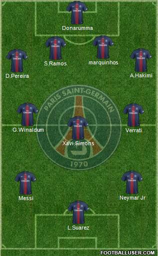 Donnarumma · Marquinhos (C) · Kimpembe · Mendes · Verratti · Ruiz · Hakimi · Neymar · Mbappé · Ronaldo · Messi