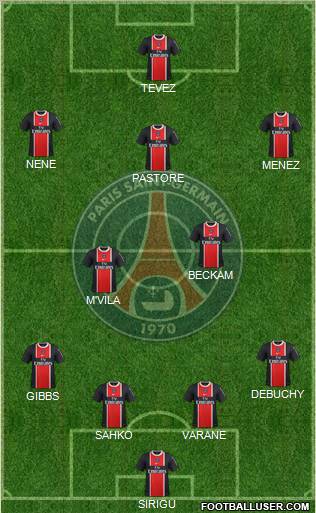 Salvatore Sirigu ~ 1 | ♥ · Diego Lugano ~ 2 | ♥ · Mamadou Sakho ~ 5 | ♥ · Sylvain Armand ~ 4 | ♥ · Christophe Jallet ~ 3 | ♥ · Blaise Matuidi ~ 6 | ♥ · Clément Chantôme ~ 22 | ♥ · Javier Pastore ~ 9 | ♥ · Jérémy Ménez ~ 7 | ♥ · Nenê ~ 10 | ♥ · Kévin Gameiro ~ 8 | ♥