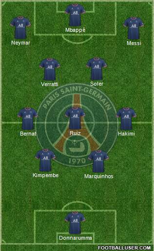 Navas (Sirigu/Donnarumma) · Maxwell (Kurzawa/Meunier) · Jallet (Hakimi/D.Alves) · T.Silva (D.Luiz/Kimpembe) · Marquinhos (Bernat/M.Sakho) · Verratti (Matuidi/Rabiot) · Di Maria (T.Motta/Makalele) · Neymar (L.Moura/Draxler) · Mbappe (O.Demebele/Beckham) · Cavani (Pastore/Messi) · Ibrahimovic (Lavezzi/Pauleta)