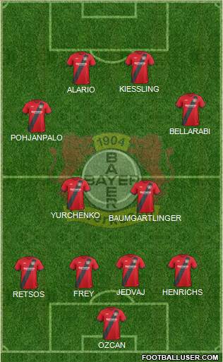 Hradecky · S. Bender · Tah · Aranguiz · Jedvaj · L. Bender · Baumgartlinger · Havertz · Brandt · Bellarabi · Volland