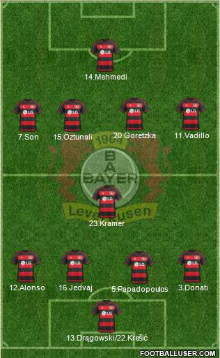 Leno · Wendell · Toprak · Tah · Henrichs · Aranguiz · Kampl · Calhanoglu · Mehmedi · Hernandez · Volland