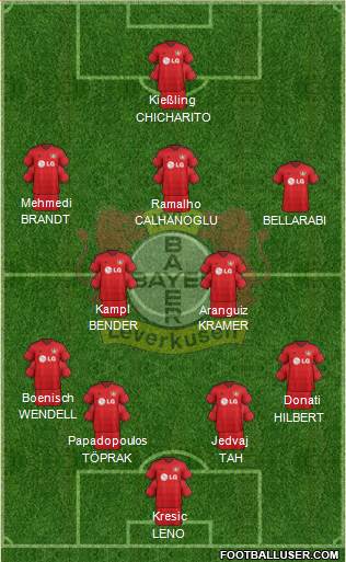 B. Leno · J. Tah · Ö. Toprak · T. Jedvaj · Wendell · K. Kampl · C. Kramer · K. Bellarabi · A. Mehmedi · Chicharito · S. Kießling