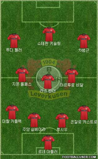 Leno [GB] · Toprak [DC] · Wollscheid [DC] · Hilbert [AD] · Reinartz [AG] · Rolfes [MDC] · Bender [MC] · Castro [MG] · Sam [MDR] · Son [AT] · Kießling [BU]