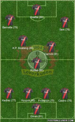 Adler · Reinartz / Toprak · Friedrich / Hyypia · Kadlec / Oczipka · G.Castro / Schwaab · Rolfes / Baltisch / L. Bender · R. Augusto / Ballack · T. Barnetta · Sidney Sam · Schürrle / Derdiyok · Kießling / Helmes