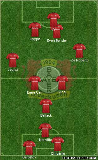 Hradecky/Ozcan · Tah/Tapsoba · Stark/S.Bender · Wendell/Sinkgraven · Weiser/L.Bender* · Aránguiz/Palacios · Eggenstein/L.Bender · Demirbay/Amiri · Bailey/Paulinho · Diaby/Bellarabi · Volland/Alario