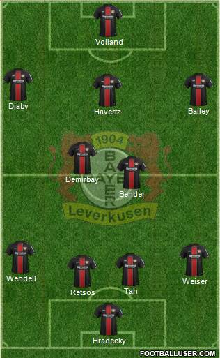 Lukas Hradecky · Sven Bender · Jonathan Tah · Kostas Manolas · Aranguiz · Kerem Demirbay · Mitchell Weiser · Wendell · Leon Bailey · Kevin Volland · Kai Havertz