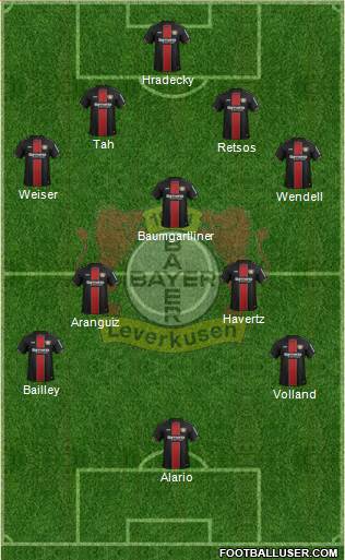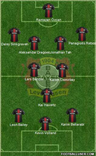 Hradecky · Tapsoba · Tah · Wendell · Weiser · Palacios · Demirbay · Havertz · Bailey · Diaby · Volland