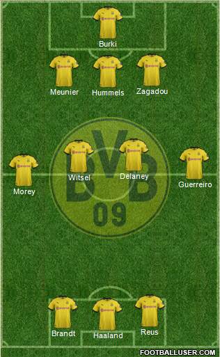 M.Hitz · A.Hakimi · L.Piszczek · M.Akanji · O.Toprak · N.Schulz · T.Delaney · A.Witsel · J.Weigl · J.Larsen · R.Guerreiro · J.Sancho · P.Alcacer · M.Reuss