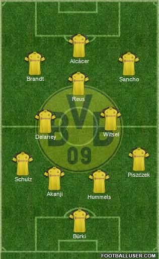 BÜRKI · HUMMELS · AKANJI · HAKIMI · SCHULZ · DELANEY · WITSEL · REUS · SANCHO · BRANDT · ALCÁCER