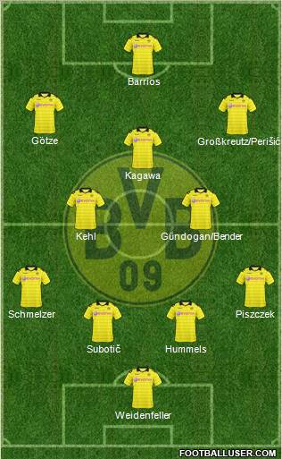 Weidenfeller · Subotic · Hummels · Piszczek · Schmelzer · Bender · Kehl · Gotze · Grosskreutz · Kagawa · Lewandowski