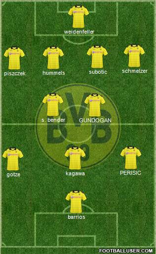 Barrios · Lewandowski · Götze · Kagawa · Schmelzer · Kehl / Gündogan · Bender · Santana · Subotic · Hummels · Weidenfeller