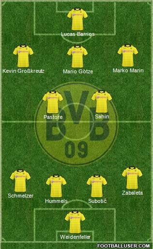 Weidenfeller · Hummels · Subotić · Schmelzer · Zabaleta · Sahin · Pastore · Hulk · Marin · Gotze · Barrios