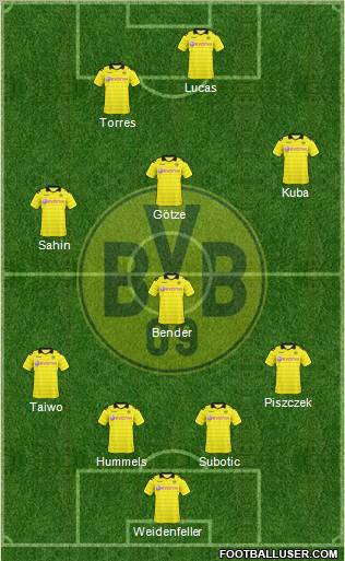 Weidenfeller · Subotic · Hummels · Piszczek · Schmelzer · Bender · Gündogan · Götze · Kagawa · Perisic · Barrios