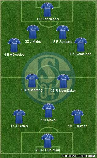 Fahrmann · Matip · Felipe Santana · Kolasniac · Howedes · K. Boateng · Neustadter · Draxler · Meyer · Farfan · Huntelaar