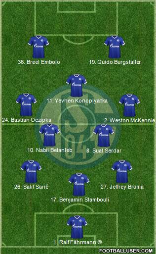 9- Lukebakio* · 7- M. Uth · 14- R. Matondo · 4- P. Fontein · 6- S. Khedira* · 24- B. Oczipka · 18- D. Caligiuri · 26- S. Sané · 22- K. Vogt* · 5- M. Nastasic · 35- A. Nubel