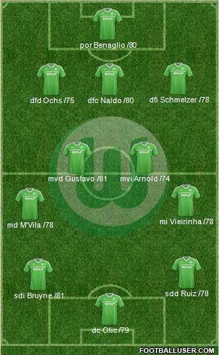 1. Zieler (78) · 31. Knoche (78) · 4. Dedé (80) · 34. Rodriguez (80) · © 15. Träsch (79) · 19. Junior Malanda (78) · 22. Luiz Gustavo (82) · 9. Perisic (80) · 8. Vieirinha (80) · 14. De Bruyne (85) · 10. Dzeko (83)