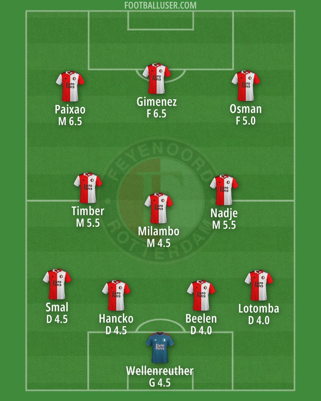 Paixão (Sauer) · Ueda (Carranza, Carrillo) · Hadj Moussa · Steijn (Stengs, Bullaude) · Timber (Moder, Valente) · Hwang (Targhalline) · Smal · Hancko · Trauner (Beelen) · Read (Lotomba, Nieuwkoop) · Bijlow (Wellenreuther, Andreev)