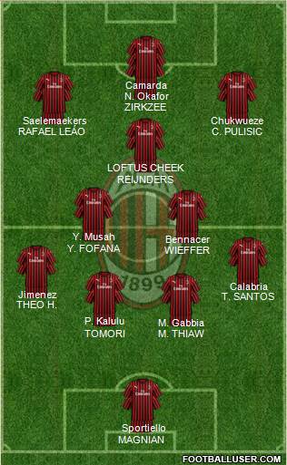 Santiago Gimenez (S. Castro) · Pulisic (Saelemakers) · Ferran Torres (R. Cherki) · Reijnders (Angelo Stiller) · Youssouf Fofana (W. Bondo) · Samuele Ricci (Y. Musah) · Walker (Jimenez) · Maignan (Sportiello) · De cuyper (Bartesaghi) · Mosquera (Pavlovic) · Comuzzo (Gabbia)