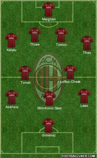 R L C (Kang-In Lee) · C. PULISIC (Chukwueze) · RAFAEL LEÁO (Saelemaekers) · A. MORATA (Jovic / Okafor) · REIJNDERS (Y. Musah) · BENNACER (Richard Rios) · J. CANCELO (Calabria) · THEO H. (Jimenez) · PAVLOVIC (M. Gabbia) · F. TOMORI (M. Thiaw) · M. MAIGNAN (Sportiello)