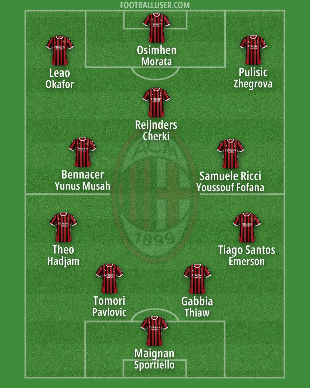Granit Xhaka (Loftus-cheek) · Youssouf Fofana (W. Bondo) · Luka Modric (Javi Guerra) · Pulisic (Liberali) · Rafa Leao (Chiesa) · Vlahovic (Santiago Gimenez) · Zinchenko (N. Fortini) · Calafiori (Pavlovic) · G. Leoni (Gabbia) · Jimenez (M. Pubill) · Maignan (Sportiello)