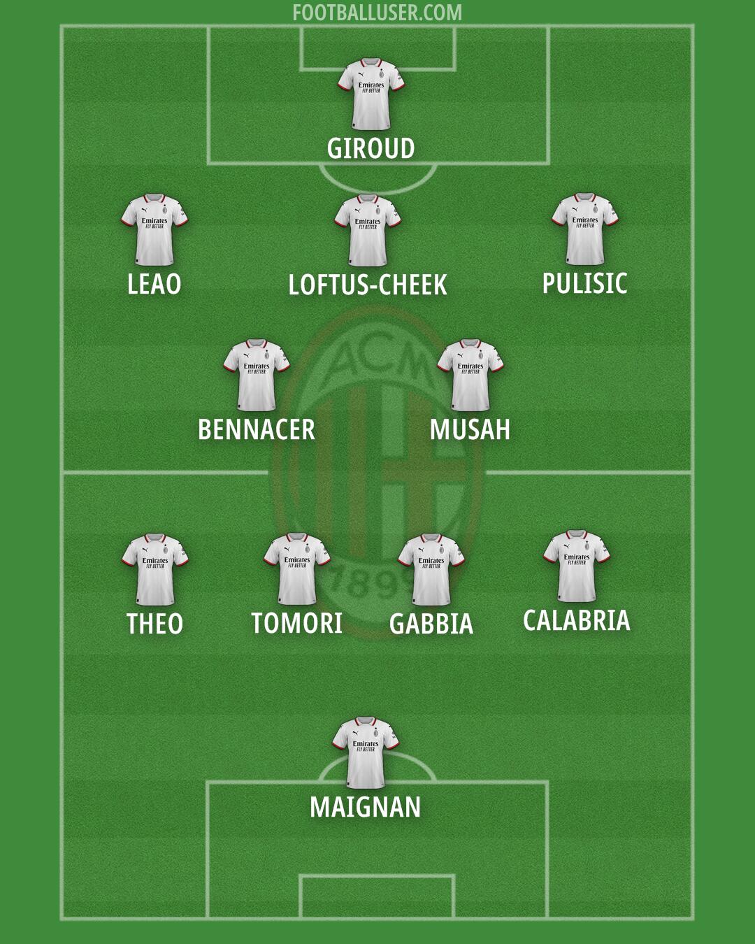 9 Gimenez · 10 David · 11 Pulisic · 18 Cherki · 19 Theo · 32 Walker · 14 Rejinders · 8 Tonali · 2 Calafiori · 13 Scalvini · 28 Thiaw · 16 Maignan · 56 Salemaekers · 20 Jimenez · 33 Bartesaghi · 29 Fofana · 73 Camarda · 46 Gabbia · 31 Pavlovic · 21 Ricci · 57 Sportiello · 96 Torriani · 5 Jorginho · 17 Okafor · 30 Liberali · 7 Adli