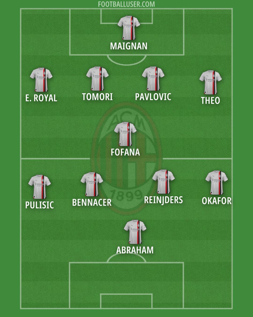 Mosquera (G. Leoni) · Pavlovic (Gabbia) · Theo (J. Hadjam) · Walker (Jimenez) · Maignan (Sportiello) · Santiago Gimenez (Luka Jovic) · Jonathan David (Rafa Leao) · Pulisic (Mastantuono) · Reijnders (L. Pellegrini) · Youssouf Fofana (W. Bondo) · Samuele Ricci (H. Caviglia)