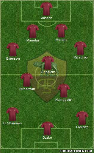 Alisson · Manolas · Fazio · Kolarov · Peres · De Rossi · Nainggolan · Strootman · Shaarawy · Florenzi · Dzeko