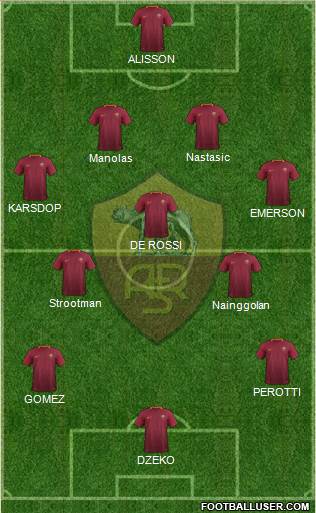 Alisson · Manolas · Fazio · Kolarov · Bruno Peres · De Rossi · Nainggolan · Strootman · El Shaawary · Perotti · Džeko