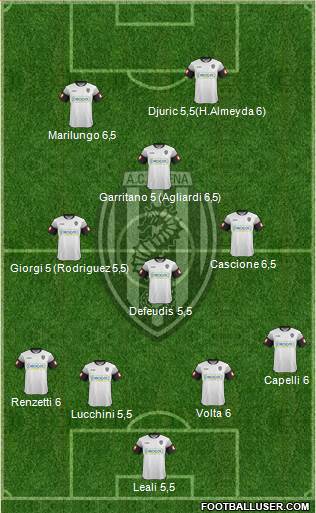 Agliardi 6 · 5 · Lucchini 5 · 5 · Volta 6 · Magnusson 5 · 5 · Capelli 6 (Garritano s.v) · Coppola 5 · 5 · De feudis 5 · 5 · Renzetti 5 · 5 · Giorgi 6 · Succi 5 (Defrel 6) · Djuric 5 · 5 (H.Almeyda 6)