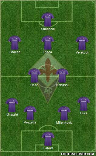 Lafont · Pezzella · Milenkovic · B.Dabo · Biraghi · Benassi · Veretout · Gerson · Chiesa · Pjaca · Simeone