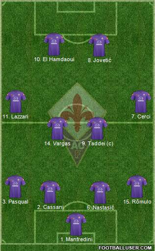 Boruc 76/32 · Cassani 78/28 · Nastasić 73/19 · Camporese 73/20 · Pisano 76/26 · Aquilani 82/27 · Borja Valero 82/27 · Vargas 81/28 · Ljajić 79/20 · Gómez 81/24 · Jovetić 84/22