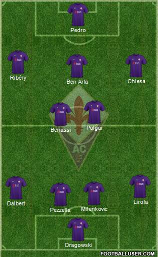 Dragowski · Pezzella · Milenkovic · Dalbert · Lirola · Benassi · Pulgar · Chiesa · Ribéry · Kouamé · Cutrone