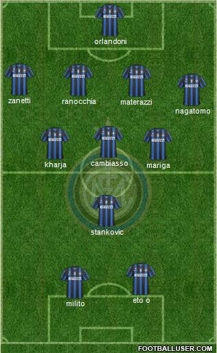 Júlio César/ L. Castellazzi · W. Samuel/ A. Ranocchia · Lúcio · C. Chivu · Maicon/ D. Santon · J. Zanetti · E. Cambiasso · D. Stankovic/ T. Motta · W. Sneijder/ P. Coutinho · S. Eto'o · D. Milito/ G. Pazzini