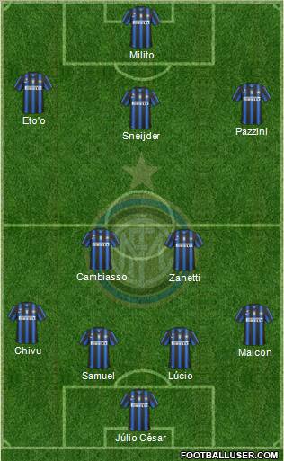 1.Julio Cesar · 26.Chivu · 15.Ranochia · 4.Zanetti · 13.Maicon · 8.Thiago Motta · 19.Cambiasso · 5.Stankovic · 10.Sneijder · 9.Eto'o · 22.Milito