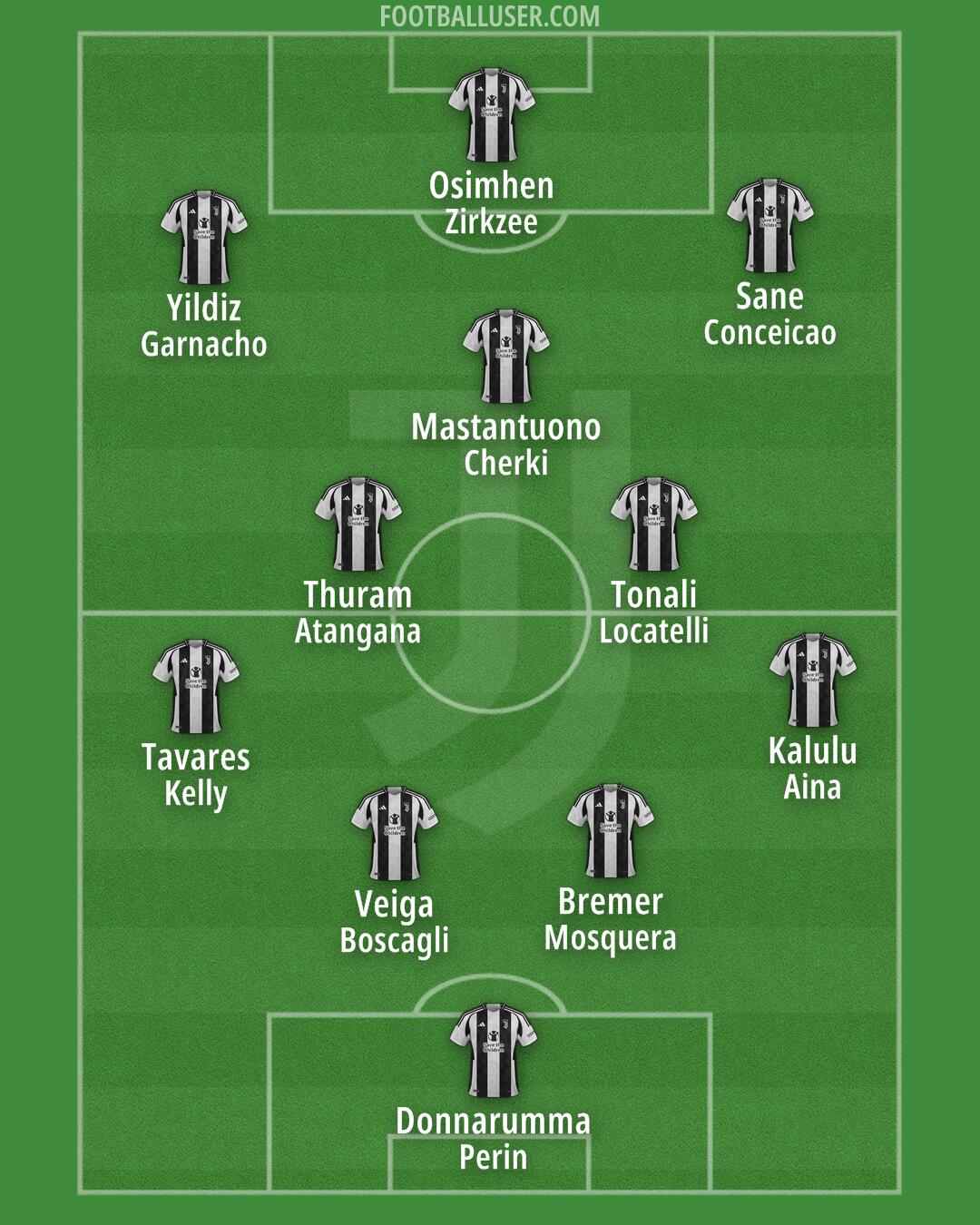 LUCIANO SPALLETTI (Allenatore) · DAVID (Openda) · TONALI (Zhegrova) · YILDIZ (Conceicao) · RODRYGO (Norton-Cuffy) · LOCATELLI (Cristante) · THURAM (Miretti) · CALAFIORI (Koopmeiners) · BREMER (Christensen) · GATTI (Kalulu) · CAMBIASO (Tavares/Cabal) · MAIGNAN (Perin/Pinsoglio)