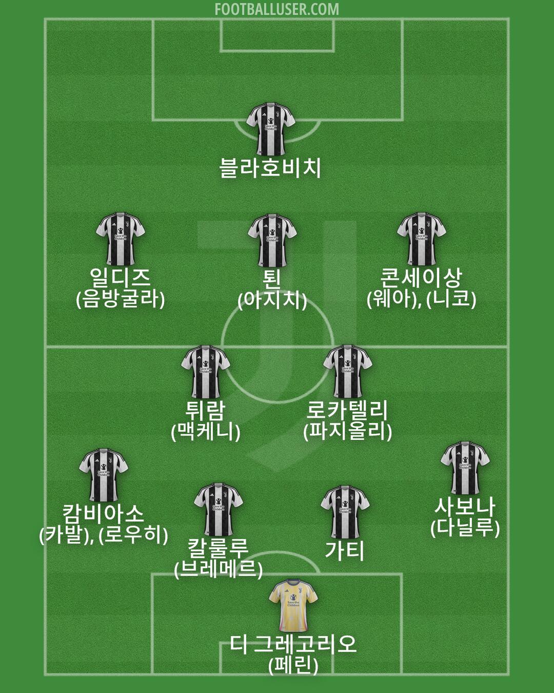 Di Gregorio (Audero) · Kim (Boscagli) · Bremer (Leoni) · Gatti · Munoz (Kalulu) · Cambiaso (Moreira) · De Jong (Locatelli) · Thuram (Bissouma) · Kovacic (Taylor) · Yildiz (Conceicao) · Sancho (Bobb) · Nunez (David) · Pinsoglio